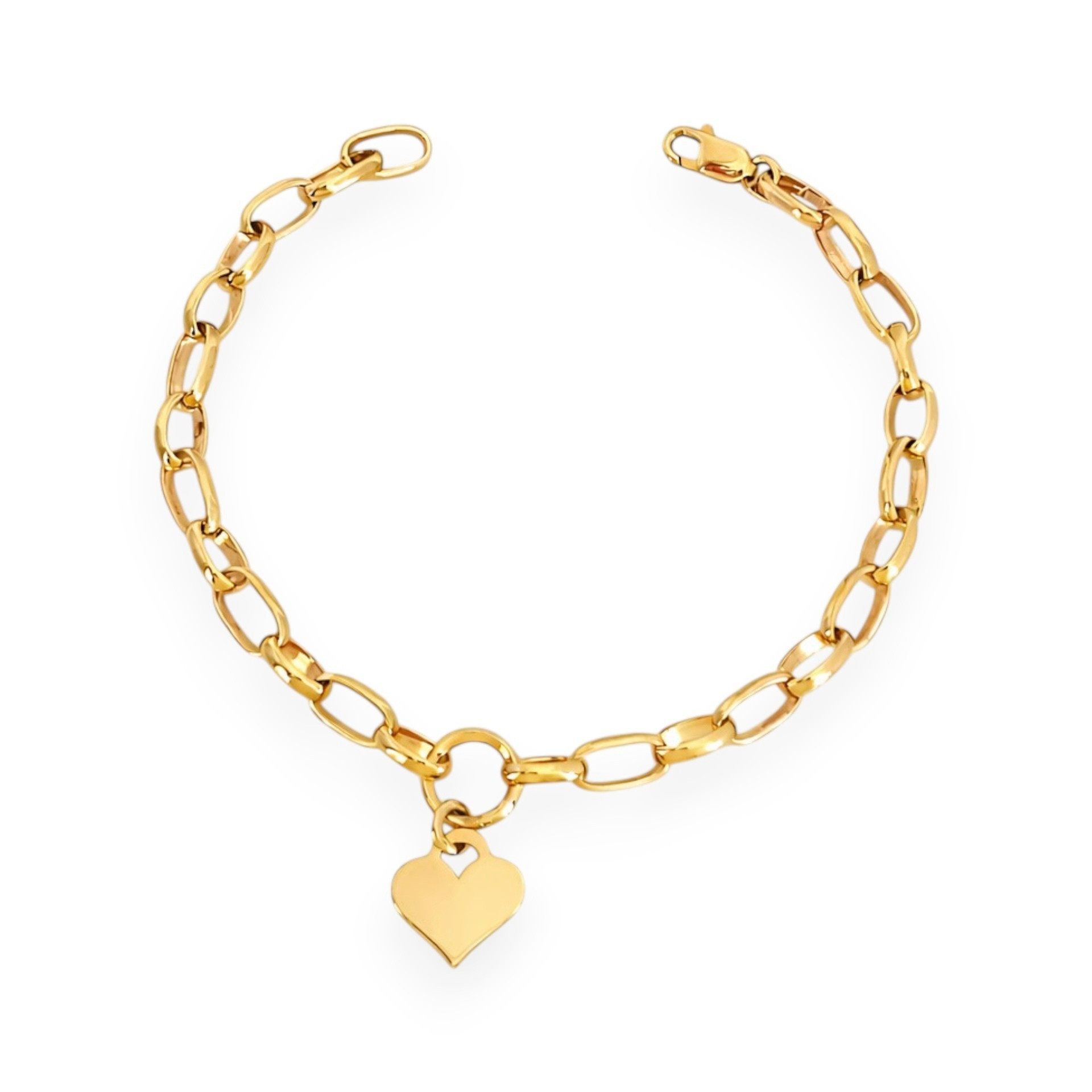 Dodaj swojej stylizacji romantycznego blasku dzięki luksusowej bransoletce wykonanej z żółtego złota próby 585. Model ten wyróżnia się efektownym splotem złożonym z dużych, owalnych ogniw o wysokim połysku, które nadają biżuterii nowoczesnego i wyrazistego charakteru. Centralnym punktem bransoletki jest gładka, lśniąca zawieszka w kształcie serca, zamocowana na ozdobnym kółku, co czyni ją idealnym symbolem głębokich uczuć.