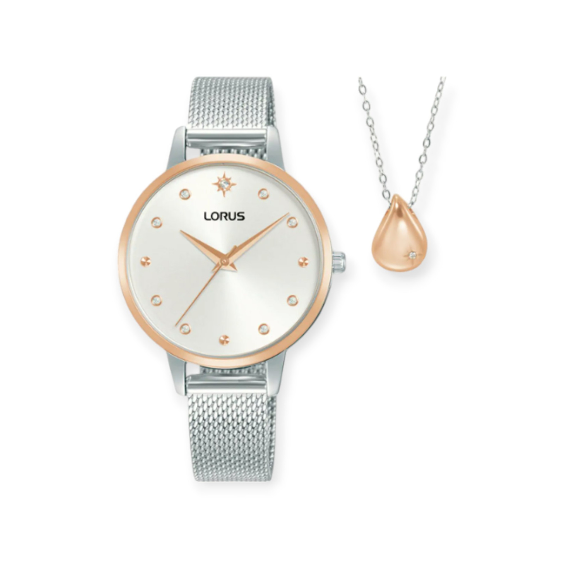 Lorus RG288XX9 Fashion Gift Set to elegancki damski zegarek kwarcowy, który jest częścią luksusowego zestawu upominkowego. Posiada srebrno-złotą tarczę i stalową kopertę, a srebrny pasek mesh dodaje mu klasy. Mineralne szkło zapewnia trwałość i odporność na zarysowania. Doskonały wybór na prezent, objęty 2-letnią gwarancją.