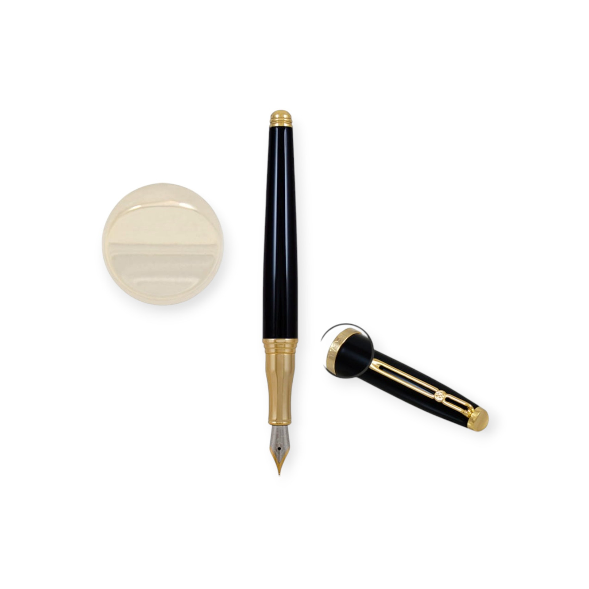 Eleganckie pióro "Buckingham" w kolorze czarnym ze złotymi okuciami, ze srebrno - złotą stalówką (1,8 x 0,8 cm), ozdobioną grawerem z emblematem marki Regal.